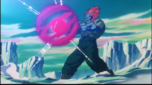 Super Saiyan Vegeta startete einen heftigen Angriff auf das mechanische Monster, aber ohne Erfolg, und selbst als Trunks und Piccolo herbeiflogen, um zu helfen, wurden beide Krieger im Handumdrehen weggeschlagen. Dann wendete er seine furchterregende Kraft gegen seine Hauptdirektive der Zerstörung: Goku selbst!
