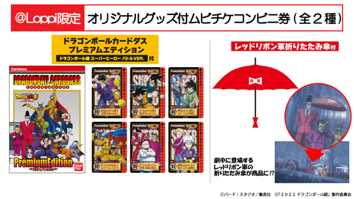 Der Carddass-Bonus ist ein Set aus 6 supercoolen Karten mit Kunstwerken von Charakteren aus dem neuen Film, während der Griff des stilvollen Regenschirms die Form des unverwechselbaren Logos der Red Ribbon Army hat! Reservieren Sie jetzt Ihre Tickets in den Lawson-Geschäften über deren Loppi-Multimedia-Terminals!!