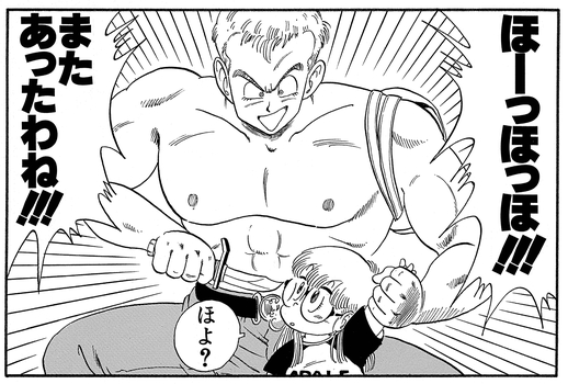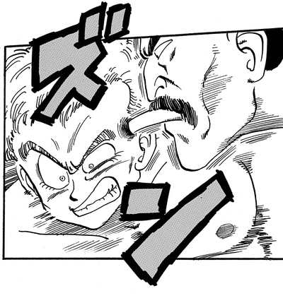 Dann nahm er Arale als Geisel und stahl das Dragon Radar , bevor er versuchte, Goku endgültig zu erledigen, aber er rechnete nicht damit, dass Arale's superstarker Kopfstoß ihn aus dem Dorf segeln ließ!