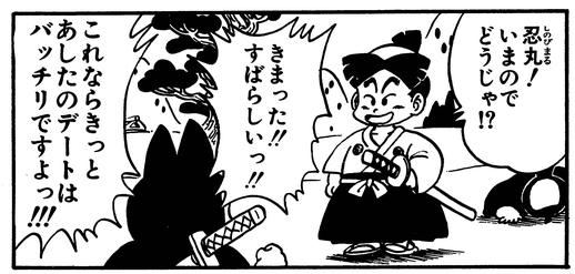 Zu Hause angekommen, ruft Ken'nosuke Shinobimaru, einen schweineähnlichen Ninja, an, um ihm genau zu sagen, was ein Date ist.
