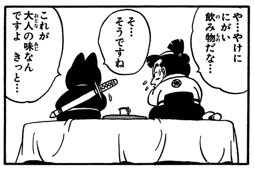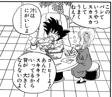 Apropos, Goku probierte als Kind auch Kaffee, ohne zu wissen, was es war, bevor er einen Schluck nahm, und dachte, es sei eine Art eklige bittere Suppe!