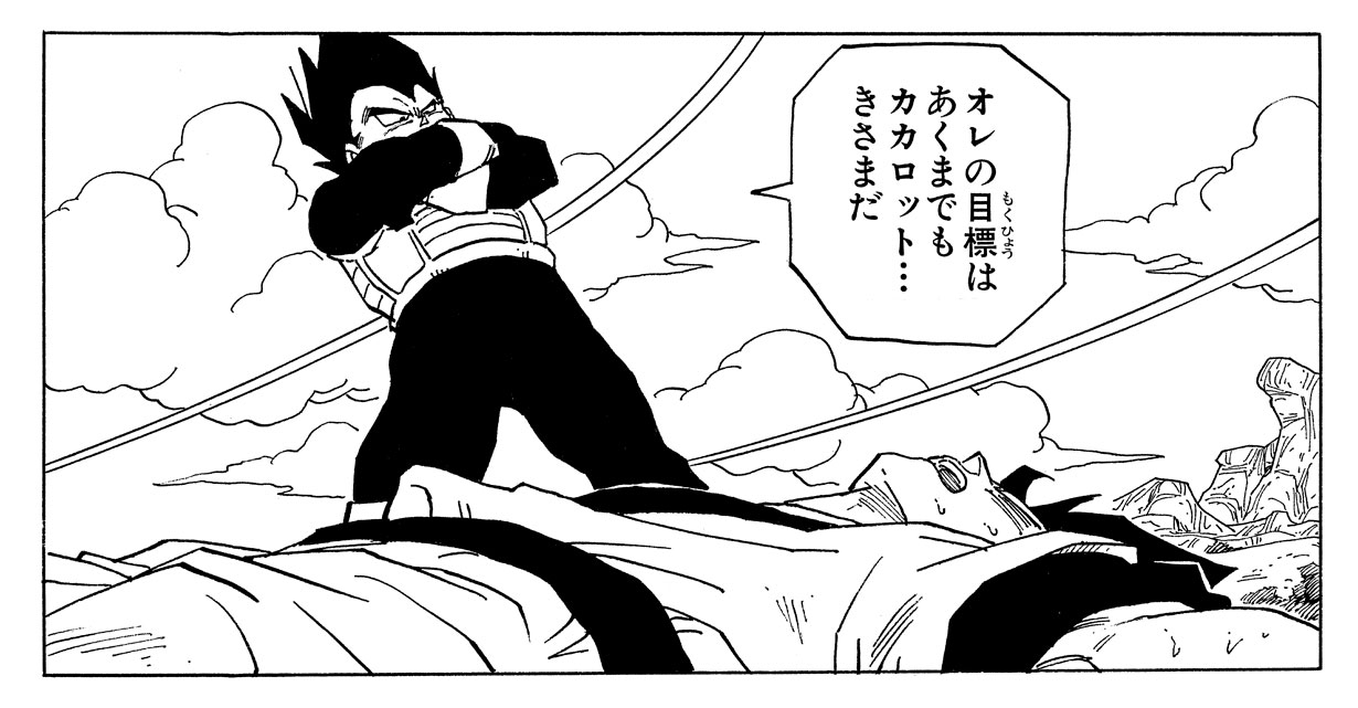--Beide Krieger teilen das Ziel, stärker werden zu wollen, aber ihre Motivationen sind von Natur aus unterschiedlich. Was mich daran erinnert, nachdem die Z-Krieger endlich Vegeta auf der Erde besiegt haben, hält Goku seine Freunde davon ab, das Leben des Eindringlings zu beenden und überzeugt sie, Vegeta entkommen zu lassen.
