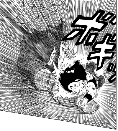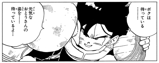 Gohan erleidet eine schwere Verletzung und steht während seines Kampfes mit dem rücksichtslosen Recoome auf der Schwelle des Todes, aber glücklicherweise kommt sein Vater Goku gerade noch rechtzeitig mit einer Senzu Bean an, um seinen Sohn zu retten.