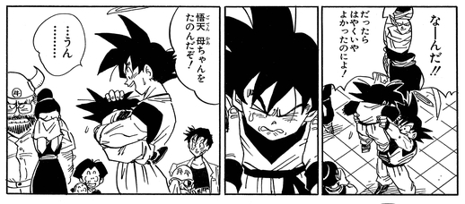 Als es für Goku an der Zeit ist, ins Jenseits zurückzukehren, möchte Goten, dass sein Vater ihn umarmt, ist aber zu schüchtern, um es zu sagen. Am Ende gibt er nach und klammert sich an seinen Vater, was zeigt, dass er zwar ein mächtiger Kämpfer geworden ist, aber innerlich immer noch ein Kind ist.