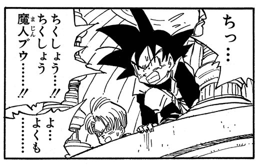 Goku und Vegeta schaffen es, ihre Söhne zusammen mit den anderen absorbierten Kriegern zu retten, aber Majin Buu verwandelt sich noch einmal und entfesselt dann einen bösartigen Angriff, der die Erde zerstört und auf tragische Weise Gotens Leben nimmt, zusammen mit dem Leben von Trunks, Gohan und Piccolo.