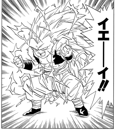 Das Haar des Benutzers wird golden, steht aufrecht und seine Kraft nimmt drastisch zu.