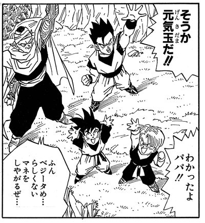 Später beherrscht Goten die „Fusion“-Technik unter Anleitung von Goku und Piccolo.