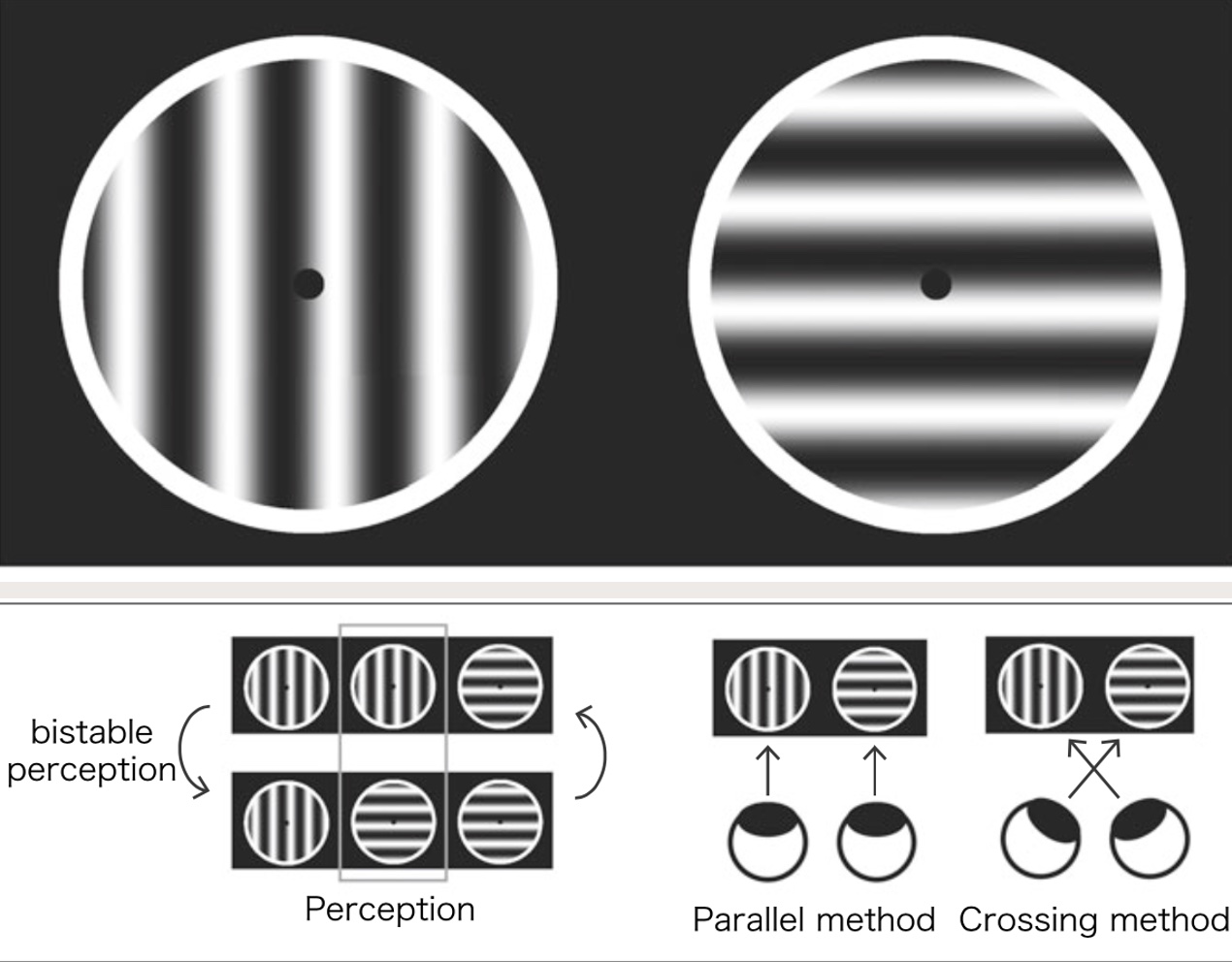 Wenn es Ihnen gelingt, die beiden unterschiedlichen Muster in Ihre beiden Augen einzugeben, werden Sie diese Illusion erleben;Manchmal sehen Sie das vertikale Muster und manchmal das horizontale Muster.