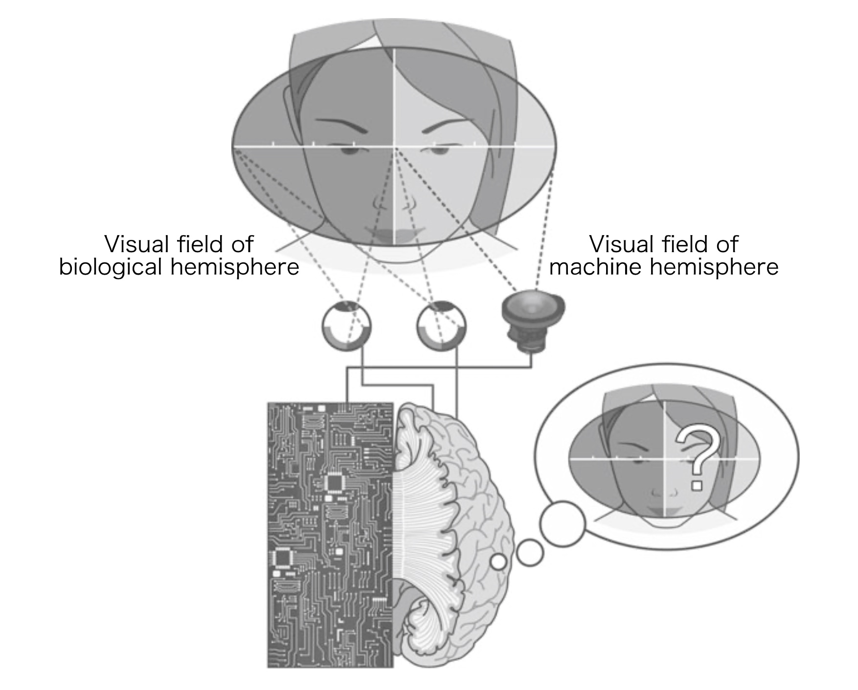Was würde dann passieren, wenn wir eine unserer Hemisphären nehmen und sie durch eine mechanische Hemisphäre ersetzen würden?Wenn wir, die wir uns in der verbleibenden Gehirnhälfte aufhalten, bilaterale Gesichtsfelder erfahren, einschließlich der von der mechanischen Hemisphäre verarbeiteten Seite, dann müssten wir aufgrund der Primär-Primär-Einschränkung schließen, dass das Bewusstsein in der mechanischen Hemisphäre entstanden ist und integriert mit unserem eigenen Bewusstseinsstrom.