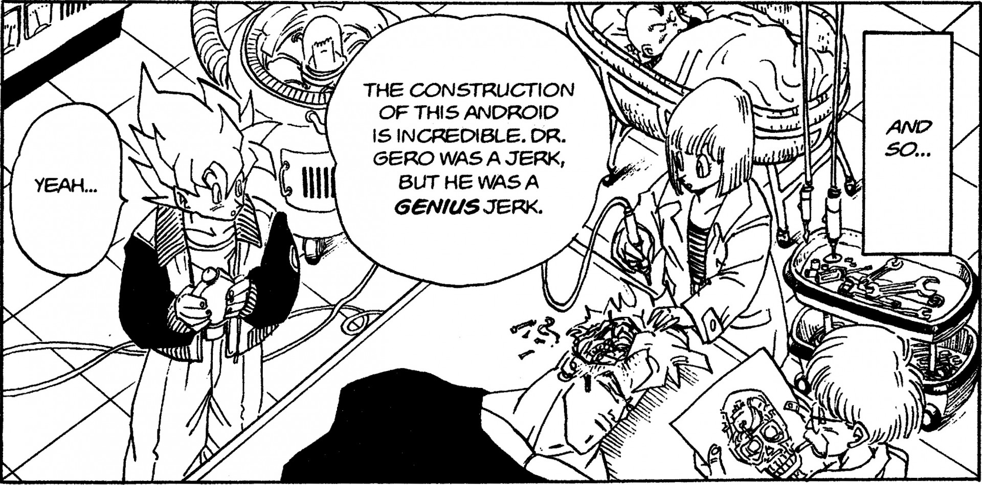 -- Dr. Gero schließlich sein Ende durch die Hände von zwei Androiden, die er erschaffen hat: 17 und 18. Sein Versuch, ihr Bewusstsein in die von ihm erschaffenen Maschinen herunterzuladen, verlief nicht nach Plan. Was denken Sie über diesen Misserfolg?