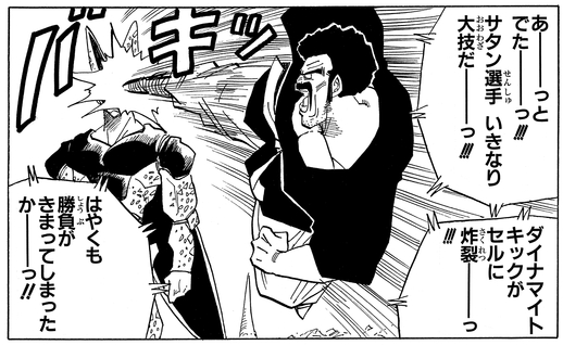 Der Weltmeister ist so von seiner Überlegenheit überzeugt, dass er eine Reihe von Angriffen auf Cell loslässt, der nichts spürt, aber so genervt ist, dass er Mr. Satan sofort wie einen Käfer wegwischt.