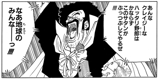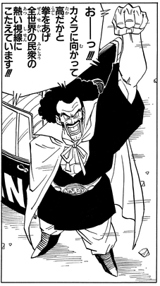 Mr. Satan kommt in einem schicken Gefährt in der Cell Games Arena an und verschwendet keine Zeit damit, dort stolz seinen Sieg zu verkünden.