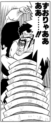 In einem Versuch, Cell einzuschüchtern, gibt er an, indem er einen riesigen Stapel von 14 Keramikfliesen direkt vor dem Bio-Android-Terror zerbricht, zeigt dann auf die Trümmer und droht, dasselbe mit ihm zu tun.