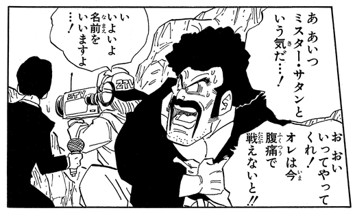 Er bringt sogar einen Sprecher eines Fernsehsenders zum Kampf mit, damit sie seine Herausforderung gegenüber Cell im Live-Fernsehen übertragen können.