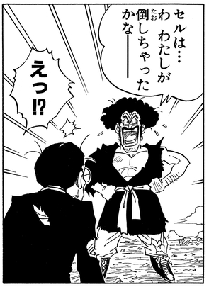 Obwohl er sich selbst ins Abseits stellt, schafft es Mr. Satan , den Kampf zwischen Cell und Gohan zu unterstützen, indem er den Kopf von Android 16 in die Nähe des kämpfenden jungen Kriegers wirft. Der gefallene Android teilt dann dem jungen Halb-Saiyajin seine letzten Worte der Weisheit mit. Infolgedessen spielt der Weltmeister letztendlich eine entscheidende Rolle dabei, Gohan dabei zu helfen, sich zum ersten Mal in den Super-Saiyan 2 -Zustand zu verwandeln.