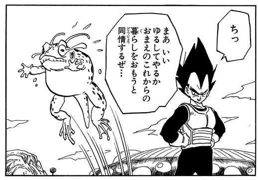 Apropos auf die Größe eines Tieres geschrumpft zu sein, er muss das gleiche Maß an Verzweiflung und Hoffnungslosigkeit empfunden haben wie Kapitän Ginyu , als er sich im Körper eines kleinen Frosches wiederfand.