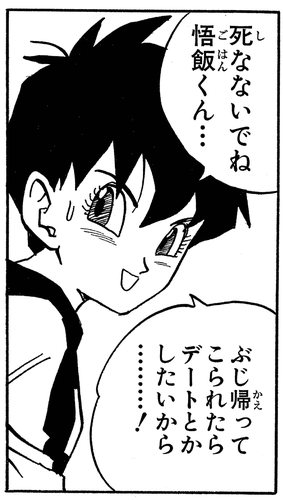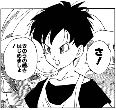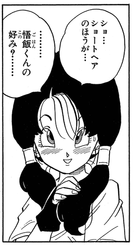 Als Gohan vorschlägt, dass sie sich die Haare schneidet, um sich im Kampf einen Vorteil zu verschaffen, interpretiert sie diesen unschuldigen Rat falsch, als würde Gohan Mädchen mit kurzen Haaren bevorzugen.