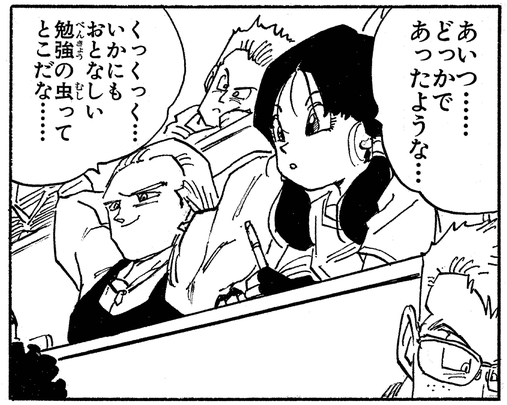 Das erste Mal, dass er Gohan sieht, ist, als der jugendliche Halb-Saiyajin in seine Klasse kommt. Anfangs hält er sehr wenig von ihm und nennt ihn einen "Geek".