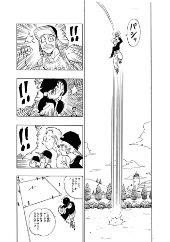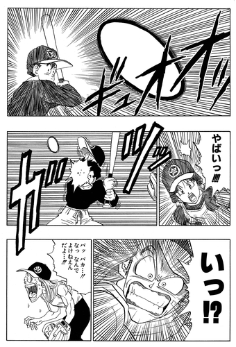 Gohan lässt Shapner jedoch kurz darauf seine Worte schlucken, indem er mühelos einen hochfliegenden Homerun-Ball fängt, von dem er dachte, dass er auf die Tribüne zusteuert!