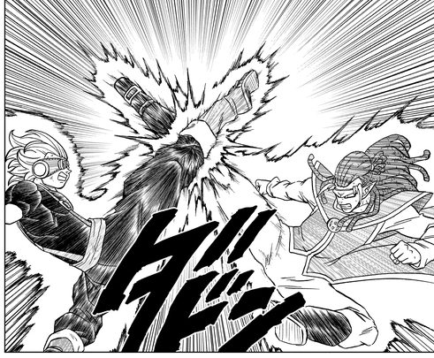 Granolah sammelte all seine Kraft, die ihm noch geblieben war, und versetzte Gas einen scheinbar tödlichen Schlag. Der ältere Bruder der Heeters, Elec, war noch nicht bereit, seine Ambitionen der universellen Vorherrschaft aufzugeben, und entfernte das Gas um Gass Stirn, um seine ungebundene, ursprüngliche Kraft zu entfesseln! Gas flog in einen Amoklauf, griff Freund und Feind gleichermaßen an, bis Elec ihn an das Versprechen erinnerte, das er vor vierzig Jahren gegeben hatte, nie wieder zu verlieren, und ihn mit der vollständigen Kontrolle über seine unglaubliche Kraft wieder zur Besinnung brachte.
