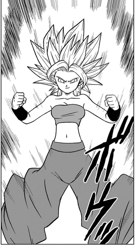 Ihr wurde von Cabba beigebracht, wie man sich zum Super Saiyan aufschwingt, und zeigte die Stärke dieser Form gegen Frieza während des Tournament of Power.