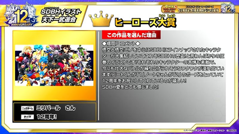 Der Gewinner des Heroes Grand Prize war die Kreation des Teilnehmers Miribaru mit dem schlichten Titel „12th Anniversary!“.