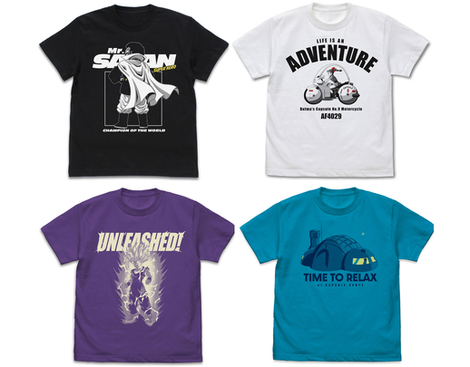 Mr. Satan sieht wie immer höflich aus , Gohan zerreißt es im Super Saiyan Modus, Bulma fährt mit ihrem legendären Motorrad und das gemütliche Capsule House sorgen für 4 fantastische T-Shirt-Designs!