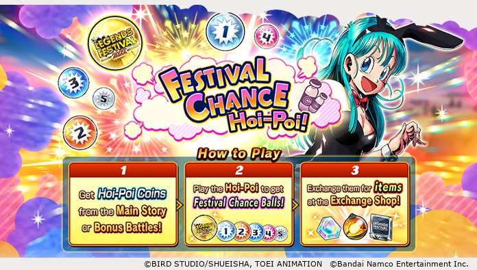 Sammle Festival-Chance-Hoi-Poi-Münzen Nr. 1, indem du bestimmte Kampfabschnitte abschließt oder Missionsbelohnungen erhältst! In diesem Hoi-Poi erscheinen Festival-Chance-Bälle mit unterschiedlichen Rängen, die vom 5. bis zum 1. reichen, plus einem Sonderrang darüber. Der Preise kann gegen tolle Gegenstände wie Chrono-Kristalle, neue Kunstkartenhüllen und Multi-Z Power 100 (LEGENDS LIMITED/SPARKING) eingelöst werden! Spielen Sie dieses Hoi-Poi immer und immer wieder und holen Sie sich den Preise !
