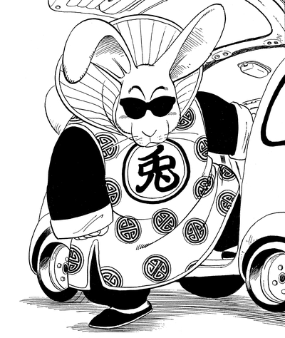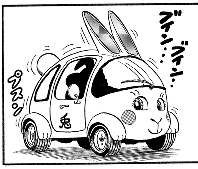 Sein bevorzugtes Fahrzeug zeigt deutlich seine Besessenheit von der Hasenform und verfügt über Ohren, Pfoten und einen flauschigen Schwanz. Es hat sogar das Kanji für "Rabbit" auf der Tür geschrieben.