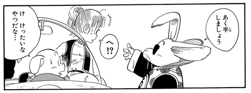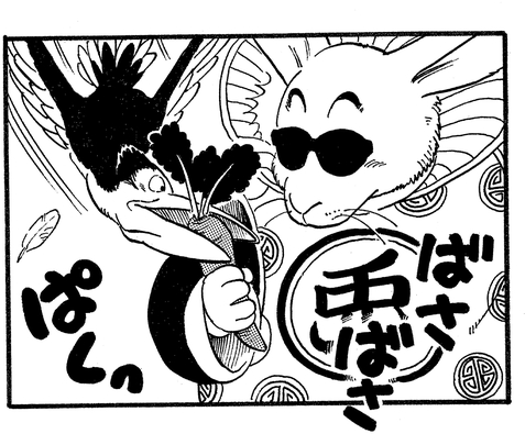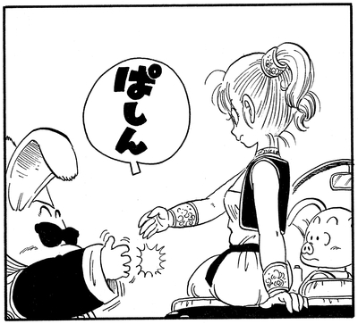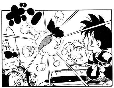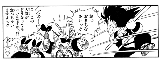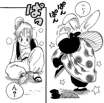 Toninjinka nimmt die karottenartige Bulma als Geisel und verbündet sich mit Goku und droht, sie zu essen, wenn der junge Saiyajin nicht tut, was ihm gesagt wird. Glücklicherweise rettet Pual den Tag, indem er sich in einen Vogel verwandelt und Bulma aus den Klauen des Hasenbosses reißt!