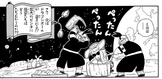 Nachdem Bulma ihre menschliche Gestalt wiedererlangt hat, dehnt Goku Nyoibo auf eine unergründliche Länge aus, um Toninjinka und seine Untergebenen zum Mond zu schicken, um eine berühmte japanische Kindergeschichte nachzuspielen.