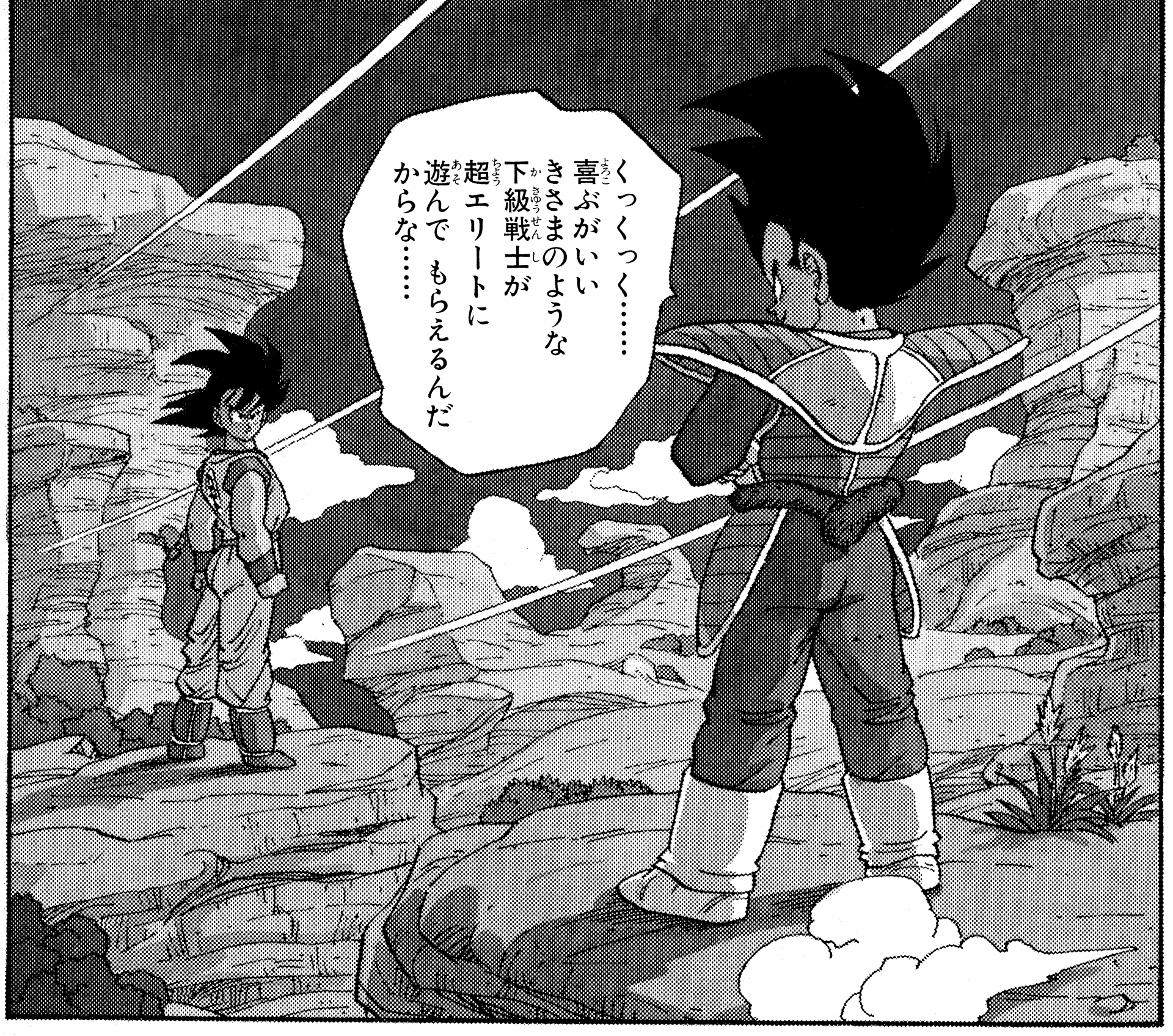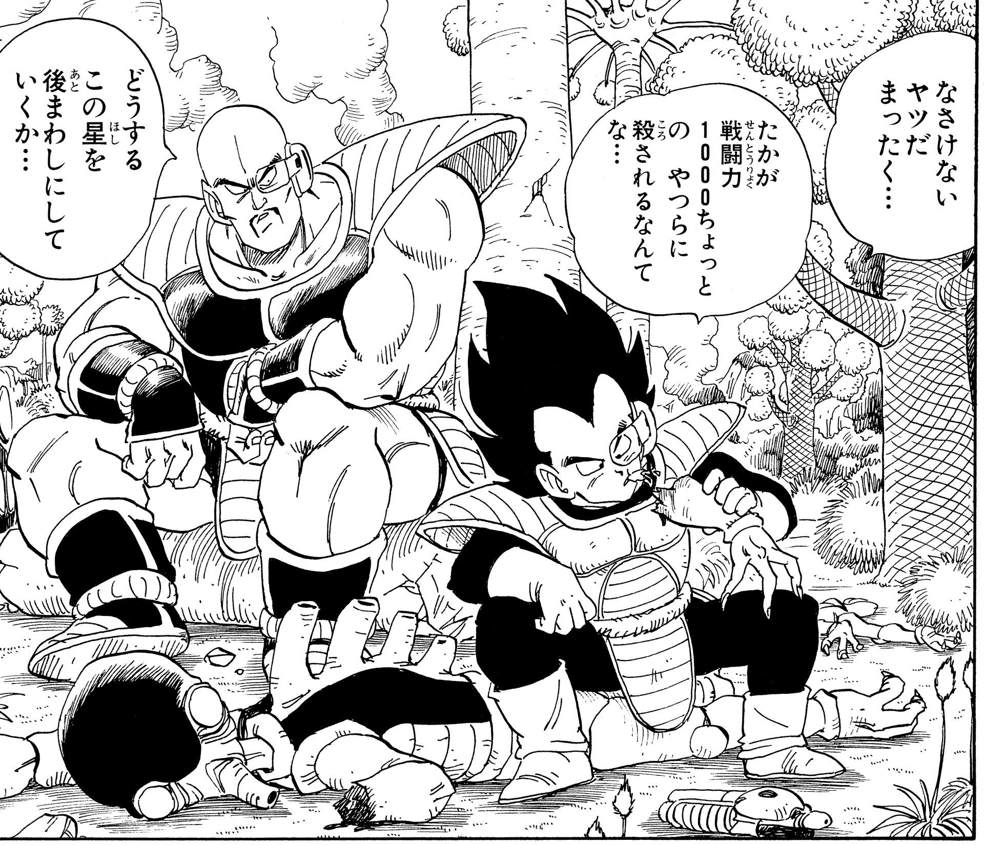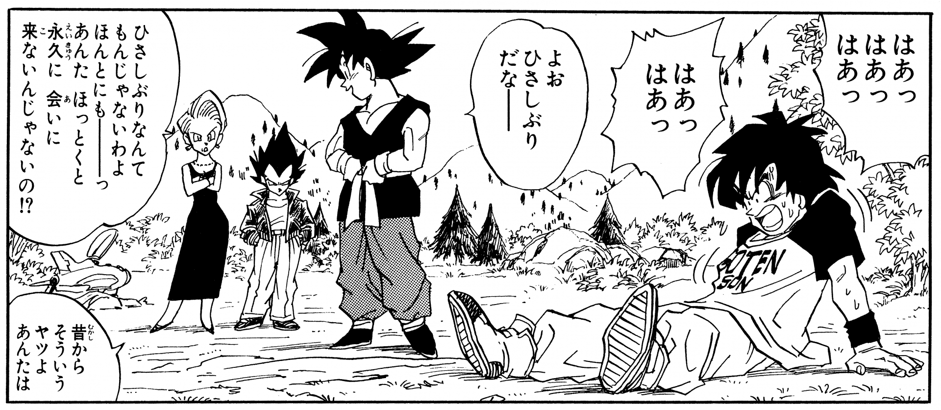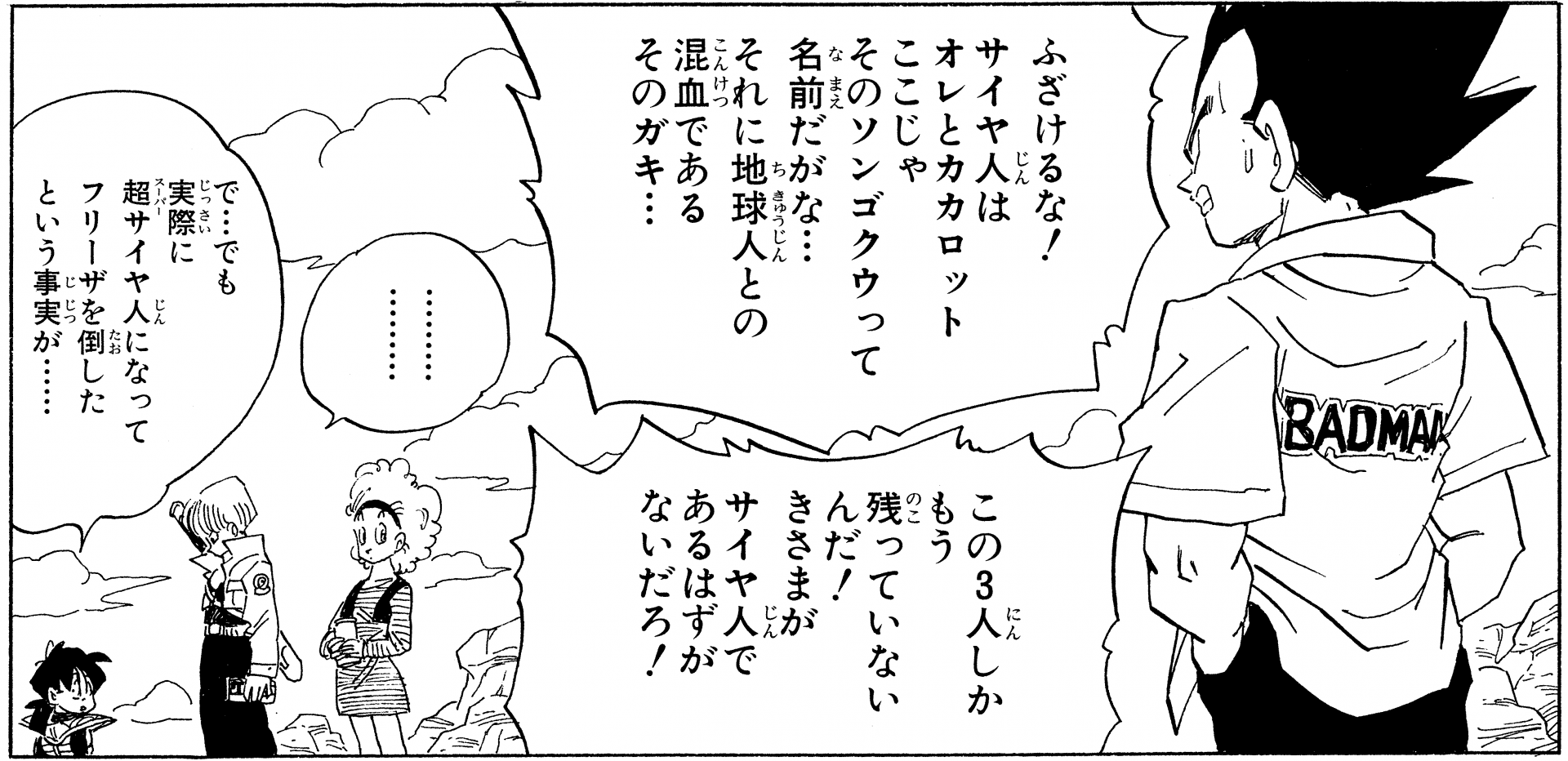 Vegeta interessantere Outfits, nachdem er bei der Capsule Corporation. Dies sind die Kleider, in denen er sich auf den Weg gemacht hat, als Frieza und King Cold der Erde einen Besuch abgestattet haben. Das Hemd war besonders denkwürdig, weil es leicht übergroß und rosa war und das Wort "BADMAN" auf der Rückseite stand. Bulma sah auch fabelhaft aus, mit ihren Haaren, die zu dieser Zeit in einer großen Dauerwelle verarbeitet waren. Vielleicht hat das Leben in West City , das die Leute dazu bringt, sich anzuziehen, um zu beeindrucken?