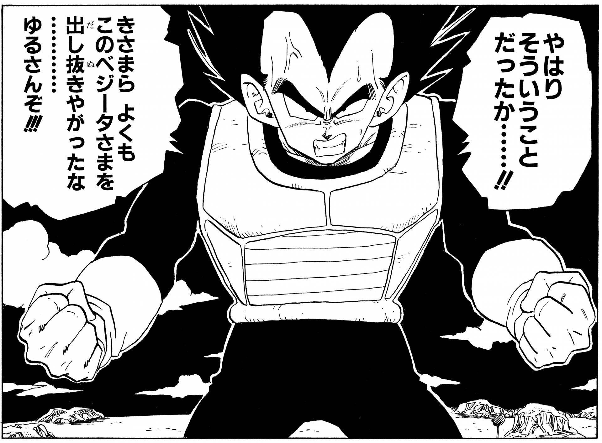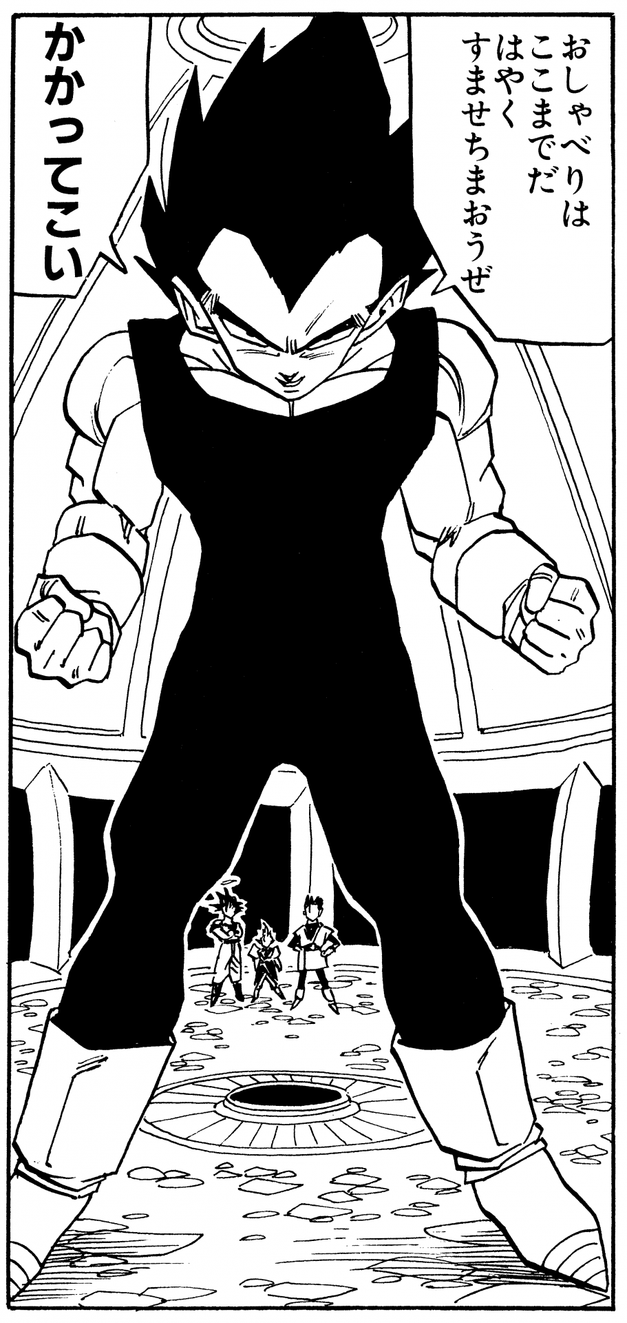 Hier haben wir eine einzelne Tafel Vegeta Jahre nach der Niederlage von Cell, die in seinem eigenen Zuhause ziemlich lässig aussieht und ein schwarzes T-Shirt und eine locker sitzende Hose mit einem Kordelzug um die Taille trägt.