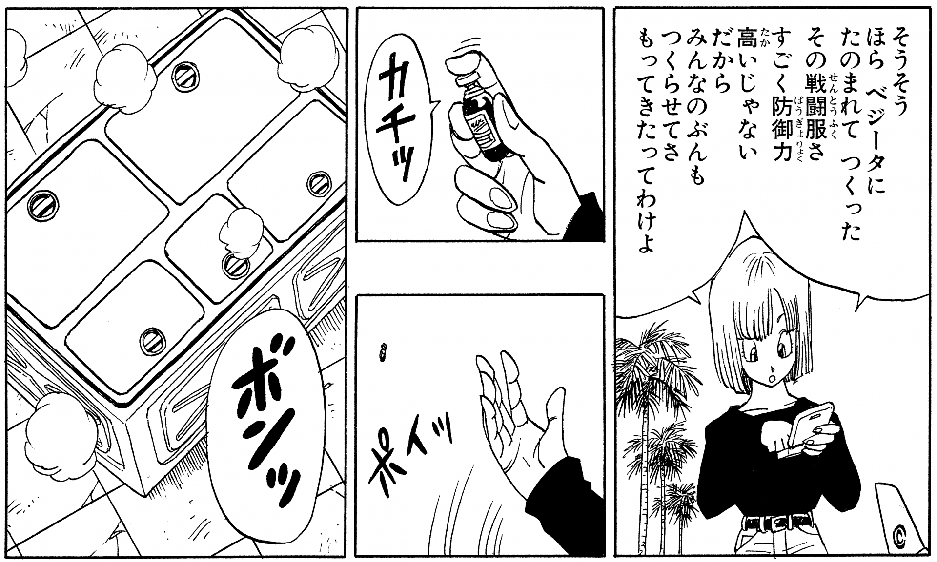In der Weste befindet sich ein kleines Kommunikationsgerät, das selbst bei einem Aufprall mit der Kraft eines Genki-dama nicht kaputt geht. Dies macht es zu einem Wunderwerk an Funktionalität und Haltbarkeit. Und dank der hochwertigen Gummimaterial sowohl in der Weste und Body verwendet wird , kann das gesamte Ensemble schrumpfen oder erweitern ihre Trägerin Bedürfnisse anzupassen, weshalb das Outfit der Lage war , mit Vegeta zu wachsen , wenn er in einen Great Ape verwandelt!