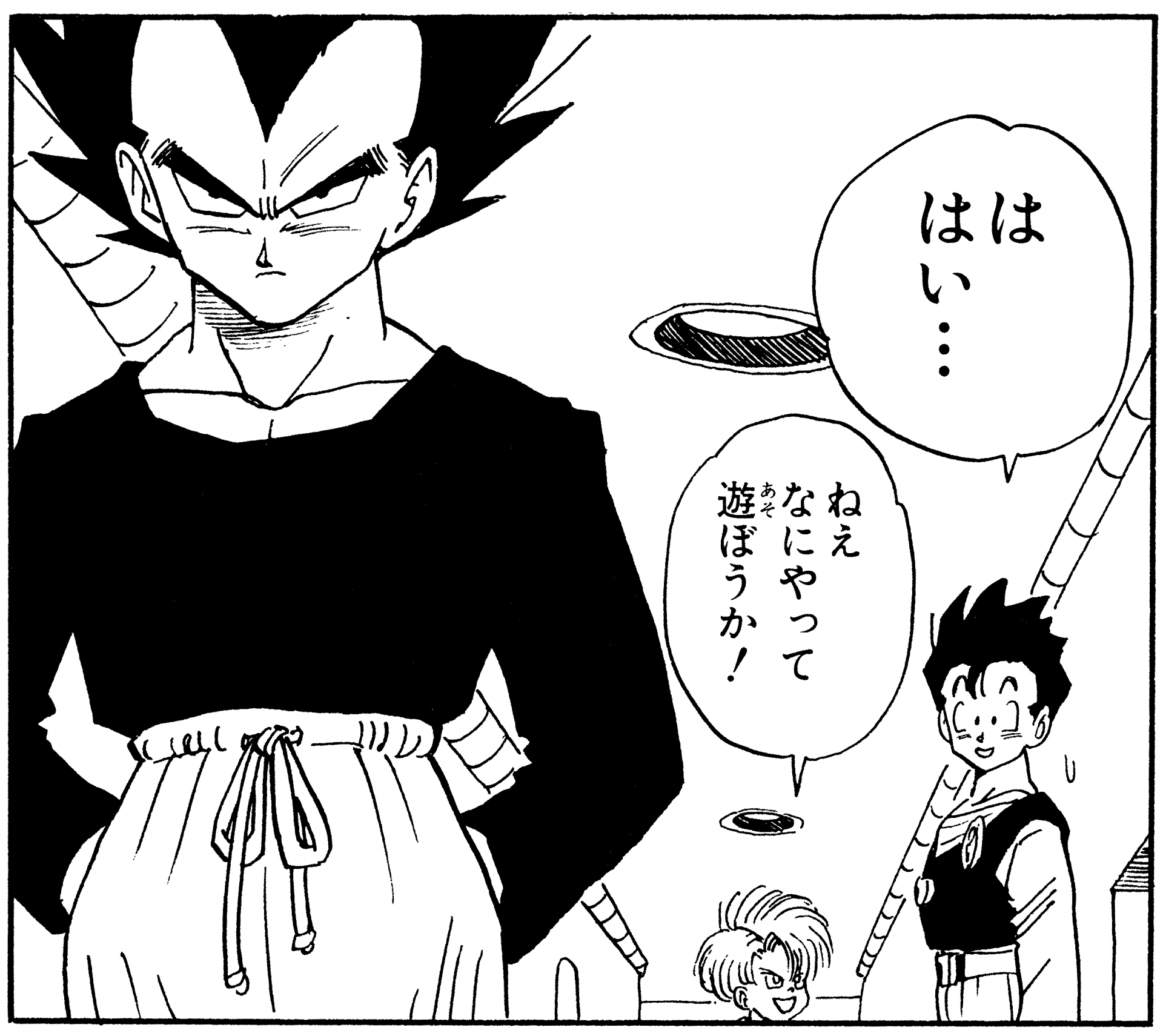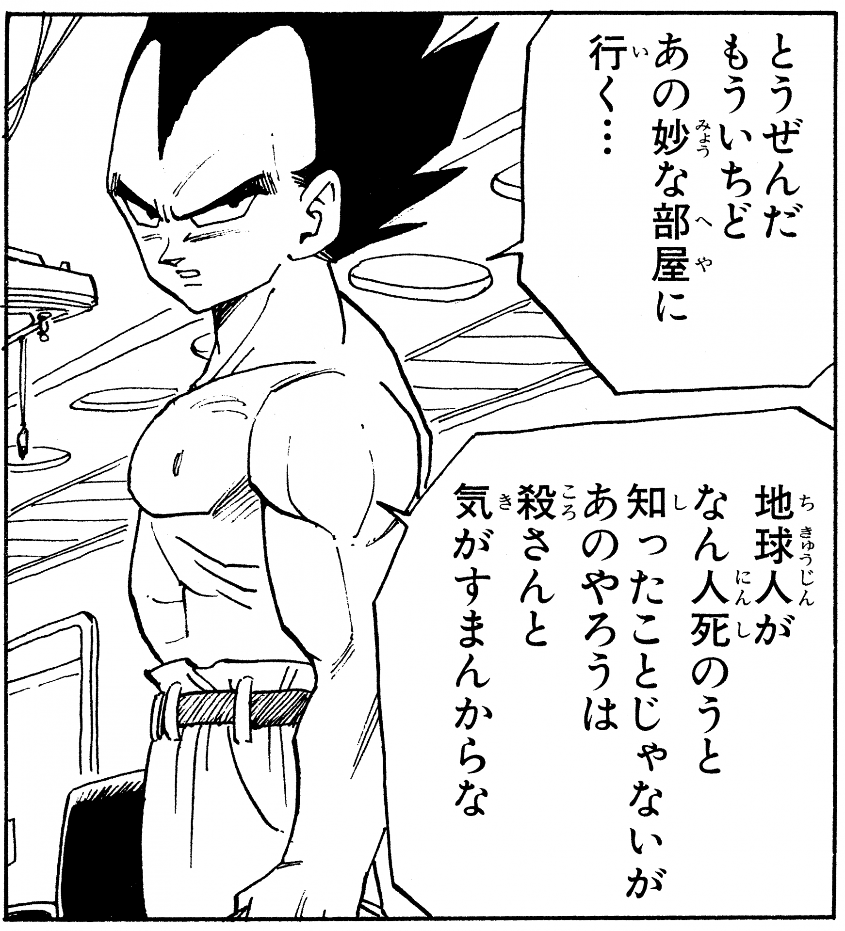 So sah Vegeta aus, bevor er sich auf den Weg zum Room of Spirit and Time machte, um sich darauf vorzubereiten, Cell herauszufordern. Vegeta hat einen Gürtel fest um seine Hose Vegeta und sieht aus, als würde er sich mehr an sein neues Zuhause auf der Erde gewöhnen, nicht wahr ?