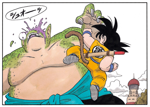Die massige Monstrosität versuchte, seine schnellen Angriffe gegen den jungen Saiyajin einzusetzen, scheiterte jedoch immer wieder daran, sein Ziel zu treffen, und am Ende wurde Drum von einem verheerenden Tritt ins Gesicht niedergeschlagen.