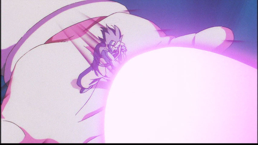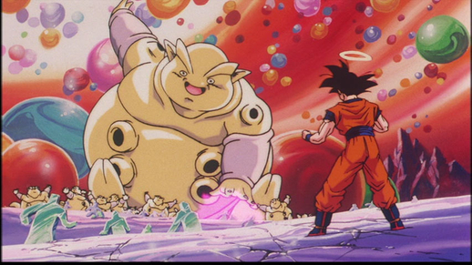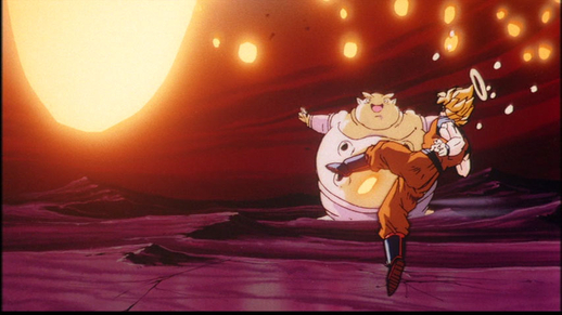 Goku verwandelt sich in Super Saiyan 3 und landet schließlich einen entscheidenden Schlag auf das Monster, wodurch er scheinbar endgültig besiegt wird ...