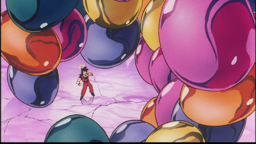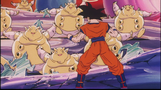 Janenba nutzt dann seine mysteriösen Kräfte, um Miniaturklone von sich selbst zu erstellen, und beginnt, Goku mit den kanonenartigen Löchern in seinem Körper zu bombardieren!