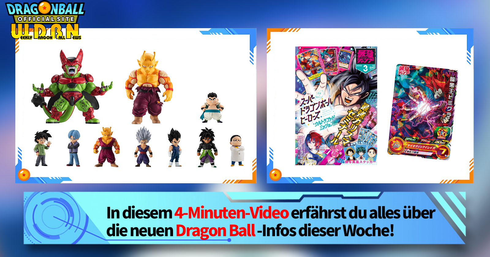 "Weekly Dragon Ball News" ist eine Videoserie, die jeden Montag (JST) aktualisiert wird, um Ihnen die neuesten Nachrichten in der Welt von Dragon Ball zu bringen! Schließen Sie sich V Jump Redakteur Victory Uchida an, wenn er über die heißesten Informationen der vergangenen Woche sowie über neue Updates wie neue Produktinformationen und Website-News für die kommende Woche berichtet!