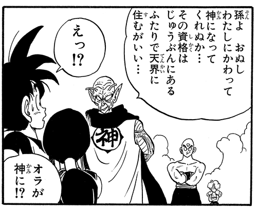 Er heilt Gokus Wunden und bietet ihm die Chance, seinen Platz als neuer Kami einzunehmen, aber Goku lehnt ihn rundheraus ab.