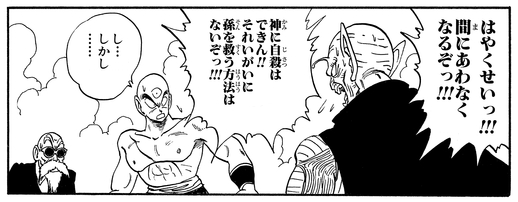 Als Goku nach einem brutalen Angriff durch Piccolo in den Seilen hängt, verlangt Kami selbstlos, dass Tenshinhan ihn tötet, denn sollte Kami sterben, würde Piccolo auch sterben. Er belügt sogar Tenshinhan , um ihn dazu zu bringen, dem Plan zuzustimmen, und behauptet, dass sie ihn danach einfach wieder mit Shenron ins Leben zurückwünschen können, aber Goku hält sie gerade noch rechtzeitig auf.