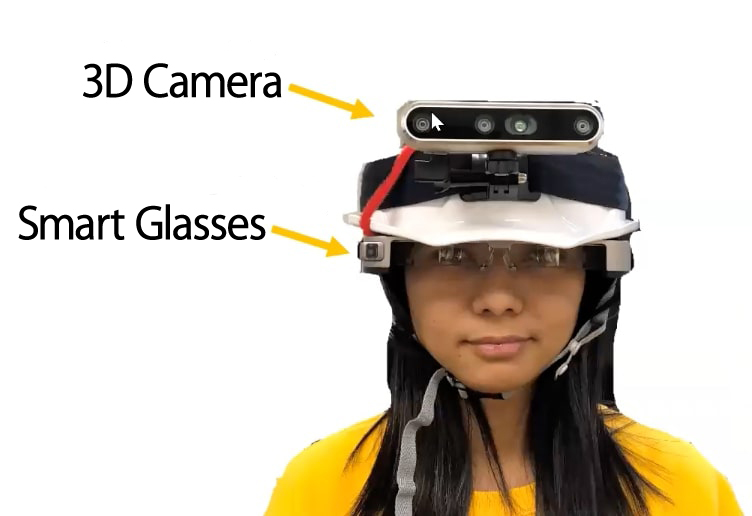 Es ist ein Gerät, das eine 3D-Kamera und eine intelligente Brille (ein brillenförmiges Display) hat, die an einem Helm befestigt sind. Die Datenbrille zeigt die Umgebung in Echtzeit an.