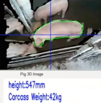 Kawasue: Es gibt eine spezielle Waage zum Wiegen von Schweinen, die von mehreren Personen bedient werden muss, aber Schweine mögen es nicht, gezwungen zu werden, darauf zu stehen. Das Idealgewicht für den Versand eines Schweins beträgt etwa 115 kg (Note: Da die Versandkosten je nach Gewicht des Schweins variieren), und wenn sie dieses Gewicht erreichen, sind sie nicht nur groß, sondern auch ziemlich stark. Schweinezüchter stehen vor einem ewigen Kampf, täglich rund 100 Schweine wiegen zu müssen. Es ist eine zermürbende Arbeit. Mit diesem Gerät können sie ihre Schweine jedoch wiegen, indem sie es einfach durch eine Kamera betrachten, was ihre Arbeit erheblich erleichtert.