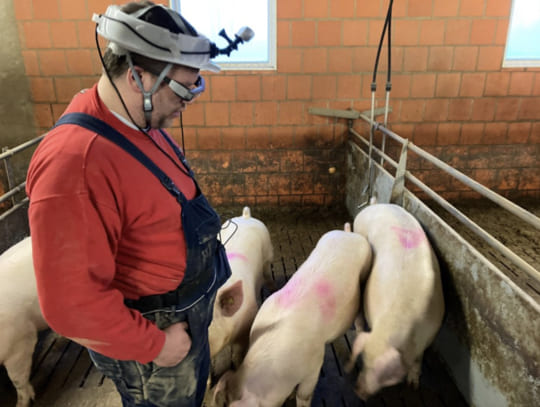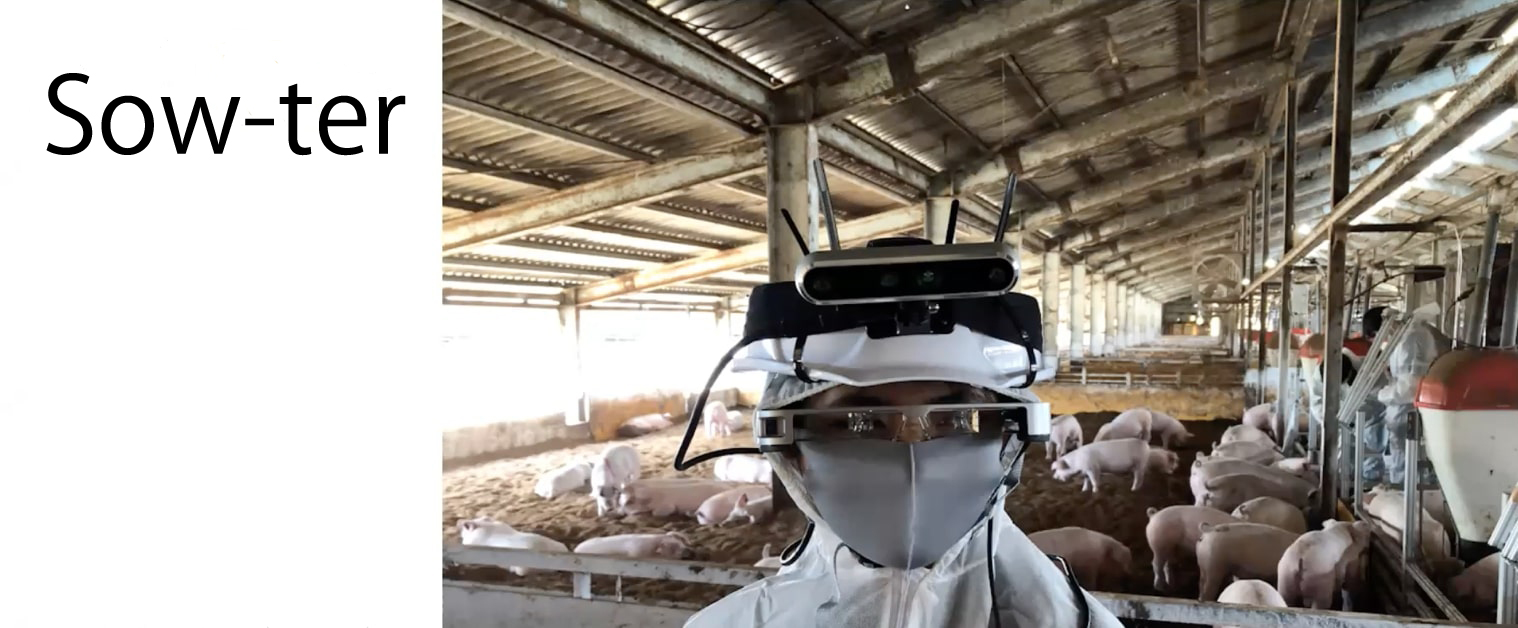 Kawasue: Ja, wir haben zuerst ein normales Display verwendet, aber als Smart Glasses auf den Markt kamen, wurde mir klar, dass ich sie für meine Erfindung verwenden könnte. Durch das Anbringen sowohl der Kamera als auch der Smart Glasses am Kopf des Benutzers bleiben die Hände frei, sodass er die Schweine weiterhin führen, die Zahlen notieren und alle anderen erforderlichen Aufgaben ausführen kann, was ihn sehr effizient macht.