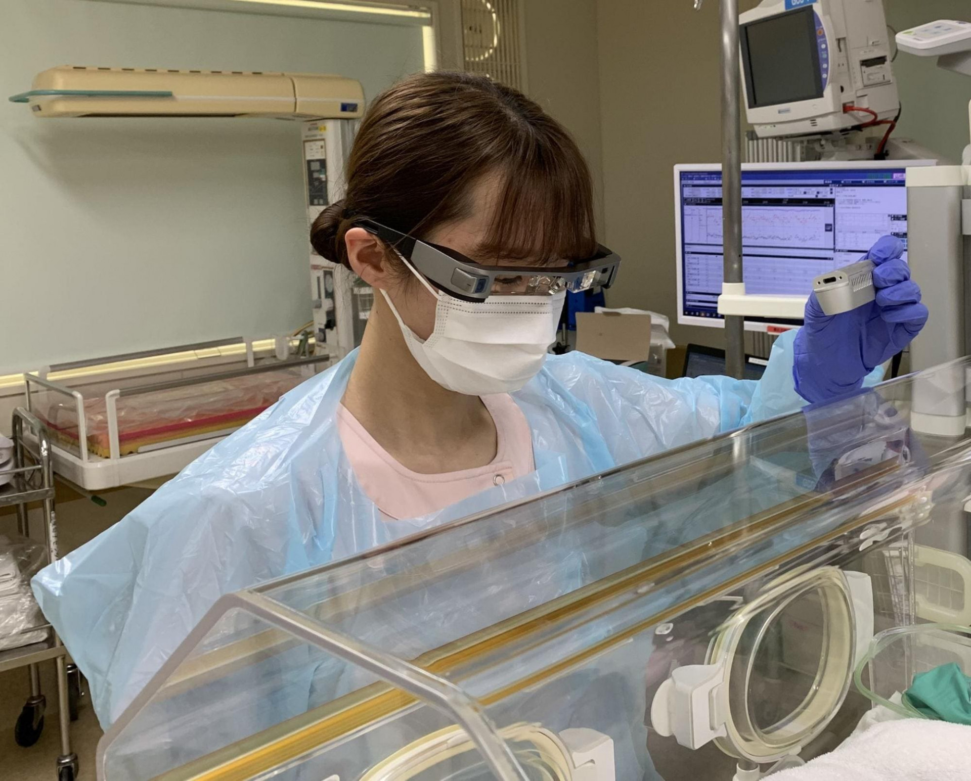 Ein "Scouter", der zum Wiegen eines Neugeborenen im Miyazaki University Hospital verwendet wird (bereitgestellt von Kawasue)