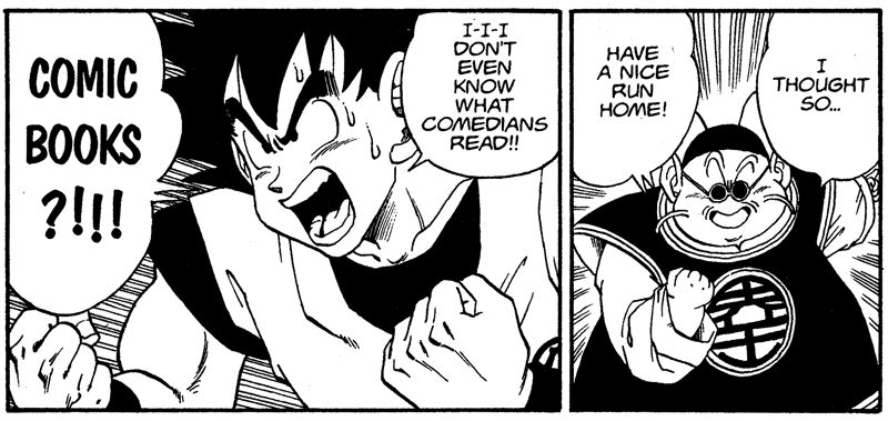 Iwai: Dann gibt es die Szene, in der Kaio North Goku herausfordert, ihn zum Lachen zu bringen, und Goku antwortet: „Ich weiß nicht einmal, was Comedians lesen!! Comics?!“ Diese Art von kitschigem Witz herauszuplatzen, wäre normalerweise ein großer Fehler in der Comedy-Welt.