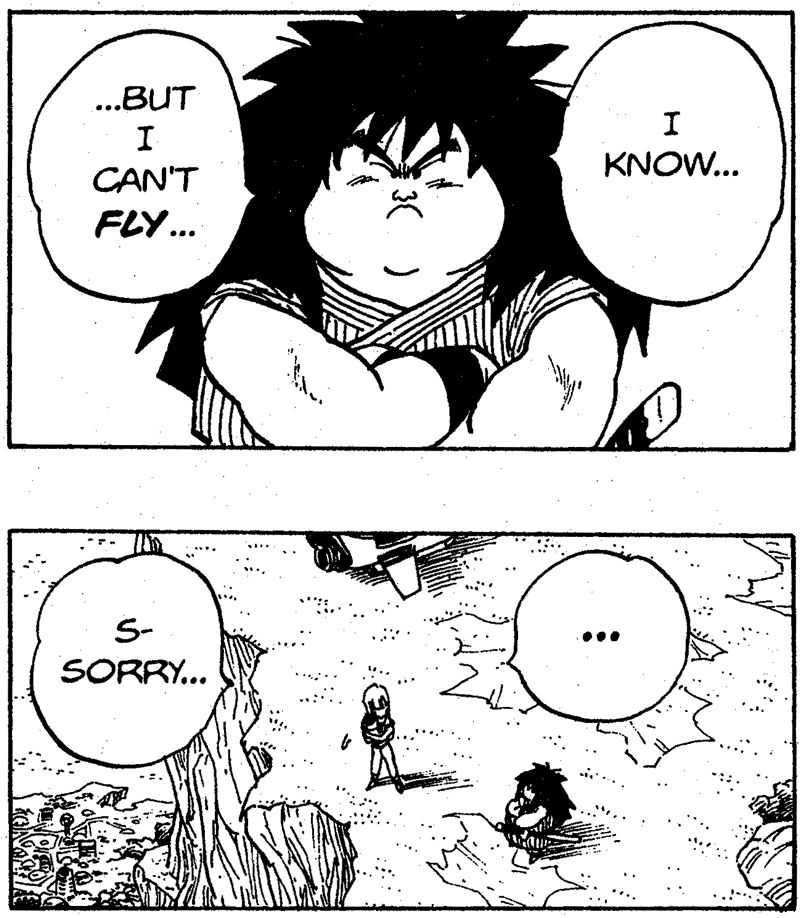 Zum Beispiel gibt es eine Szene, in der Yajirobe sich weigert zu gehen und zu kämpfen, als Dr. Gero und Android 19 in der Geschichte auftauchen. Als Bulma ihn dazu drängt zu erklären, warum er nicht für den Schutz des Planeten kämpfen wird, gibt Yajirobe schließlich zu, dass es daran liegt, dass er nicht fliegen kann. Richtig, er kann das Buku-jutsu (Schwebetechnik) nicht anwenden, das die anderen Kämpfer vor langer Zeit gemeistert haben. Sogar Bulma verstummt, als sie das hört.