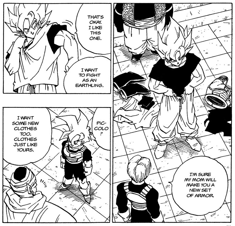 Aber als ich den Manga als Erwachsener noch einmal las, hatte ich wirklich das Gefühl, dass er Piccolo ein bisschen zu sehr mag. Wie vor den Cell Games, als er nach dem Training mit seinem Vater aus dem Room of Spirit and Time auftaucht. Goku und Gohan wechseln ihre Kleidung, richtig? Goku zieht seine übliche Kampfsportuniform an, aber Gohan sagt, dass er Kleidung wie die von Piccolo haben möchte.