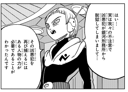 Merus setzt Goku und Vegeta außer Gefecht, als sie kommen, um ihren dicken rosa Kumpel zu retten, und bringt die beiden Saiyajins zum Galactic Patrol HQ , damit er die Situation erklären kann. Der Streifenpolizist bittet dann Goku und Vegeta um Hilfe bei seiner Suche.