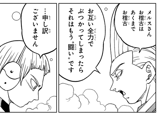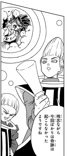 Engel dürfen nicht in echten Schlachten kämpfen, und so ist Merus gezwungen, seinen Plan aufzugeben, gemeinsam mit Goku gegen Moro zu kämpfen.